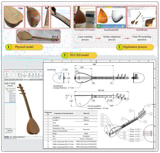 The sample “cura baglama” used in this study was made by an instrument maker (Mr. Dundar ALTUN) in Ankara, Turkey, in 2019. The instrument has various parts made of different wood-based materials, three string groups, and six cold-drawn steel strings (ASTM A228) [] coded from S1 to S6, from the lower to the upper group. The soundbox was made using a handcrafted carving. The major components, such as the soundbox, soundboard, and neck, were joined using a hot-melt adhesive (bone glue). The reverse engineering approach and advanced solid modelling techniques were applied in the solid modelling process to generate accurate three-dimensional (3D) computer-aided design (CAD) data of the cura baglama. The 3D scanning and digitisation of the physical sample were performed using a NextEngine-2020i desktop 3D laser scanner and Scan-StudioHD (v 2.02) software. The final surface refinement and additional modelling operations were carried out using SolidWorks (v 2022) 3D parametric solid modelling software. Figure 1 shows the digitisation procedure from physical objects to 3D CAD data and highlights the key geometrical features and component material list of the scanned sample.