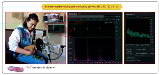 In this study, the cura baglama was tuned with a digital tuner and frequency analysis was carried out for each string of the instrument with single plucking sound records via Adobe Audition (v 2022) audio processor software. Sound recording was realised with a 44,100 Hz sample rate, 16-bit bit depth, and mono channel recording using a Logic Pro X digital audio workstation system, including an SE Electronics Z3300A Multi-pattern Microphone and an Apollo Twin Duo MKII soundcard. A professional baglama performer (Dr. Sevilay GOK) generated identical single-plucking actions. A thermoplastic plectrum was used in plucking. The Shore-A scale (ASTM D2240 ISO/868) was utilised in the hardness measurements of the plectrum. The hardness measurement was repeated five times and the average scale was obtained as 83 ± 2. Three repetitions of the plucking action were recorded for each of the strings, and then average values were calculated. The instrument adjusted to the tunings (end tune) of B2 (Si), C3 (Do), and D3 (Re) referenced to the tune of A4 (La) at 440 Hz, respectively. “Playing end note or playing tuning or end tune” is defined as the concluding note of a melody/musical phrase/composition or its modal progression, and within Turkish Folk Music, it encompasses various forms of determining tonality and their corresponding sound characteristics. Turkish terminology refers to this particular definition as the “karar”, “eksen”, or “durak” sound [,].