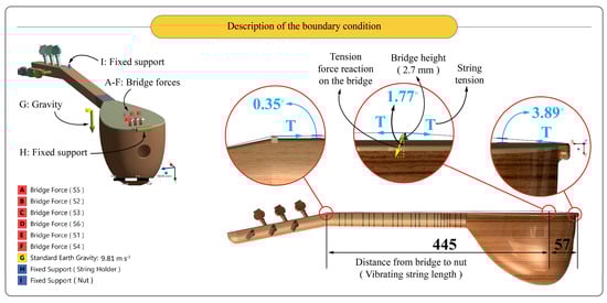 The instrument consists of various components made from different materials. The materials utilised for the instrument components were separately assigned. Most importantly, wood-based materials exhibit anisotropic material behaviour because of the nature of their inner structure, and this may result in some limitations such as converging problems, increasing solving time, etc., in engineering simulation studies. Therefore, some assumptions are inevitable. In this regard, the critical components, such as the soundboard and neck, were defined using a homogeneous linear orthotropic material model, which takes into account their susceptibility to deformation. The remaining components were assumed to be made of homogeneous linear isotropic material [,,,,,,,]. The material properties assigned to the instrument’s components in the analysis setup are given in Table 2. The description of the boundary conditions, including forces acting on the bridge, and visual and numerical details of the FE model are given in Figure 3, Table 3, and Figure 4, respectively.