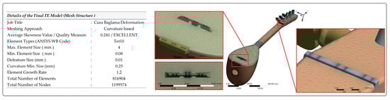 The FE model (mesh structure) was constructed using the FEA code’s meshing functions. To ensure accurate results, curvature-based meshing approaches were employed, and smaller element sizes were assigned to specific components such as the string holder, bridge, and head nut. The appropriate element size for the FE model was determined via pre-trials. To assess the accuracy of the FE model and to make internal verification, a skewness metric was employed, which measures the deviation of the elements from equilateral cells. A skewness value of 0 indicates perfect cell quality, while a value of 1 indicates fully degenerated cells (0: equilateral; >0–0.25: excellent; 0.25–0.50: good; 0.50–0.75: fair; 0.75–0.9: poor; 0.9–<1: bad; 1: degenerate) [,]. The FE model had an average skewness metric value of 0.241, which is considered excellent cell quality.
