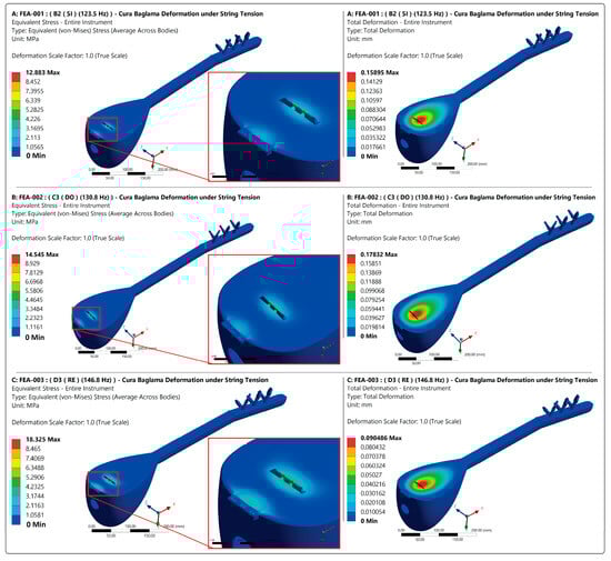Traditional musical instruments constitute an integral part of humanity’s historical heritage. In order to preserve their legacy for future generations, it is imperative to ensure that their structural design specifications are adequately documented for future research and cultural purposes. In this focus, the structural behaviour of a stringed instrument can be studied under three main categories: first, the behaviour of the stretched string manipulated by the player; second, the reaction of the wooden soundbox of the instrument and the surrounding air to the string’s movement; and third, the radiation of sound, which primarily originates from the soundbox and displays a complex directional dependence []. As a part of the structural design analysis of a traditional string instrument, this study aims to analyse the structural deformation of a sample cura baglama with different string tension forces using FEA. In the study, a three-dimensional (3D) solid model of the cura baglama was created using a reverse engineering approach. Different string tensions, which were analytically calculated via experimental frequency data measurements that correspond to three different tunings, were applied to the instrument model, and the structural deformation behaviour of the instrument was simulated.