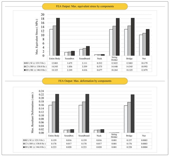 In this context, it is an important point to research and present new ideas about the development of such instruments. Especially in the durability perspective that also affects sustainable sound production, it is important to understand the deformation behaviour of a stringed instrument’s structure under string tension in static and dynamic conditions. Structural deformation analysis is important for string music instruments because it helps ensure that the instrument can withstand the stresses and strains of playing and tuning. This type of analysis can reveal potential weak points in the instrument’s design, such as areas of high stress or areas where the wood may be prone to cracking. By identifying these issues early on, instrument makers can take steps to prevent or mitigate them, ensuring that the instrument is durable and able to produce high-quality sound for a long time. Additionally, analysing structural deformation can help instrument makers optimise the design of the instrument for improved sound quality and playability. In this regard, the utilisation of advanced computer-aided engineering (CAE) analysis techniques such as finite element analysis (FEA) may be useful [].