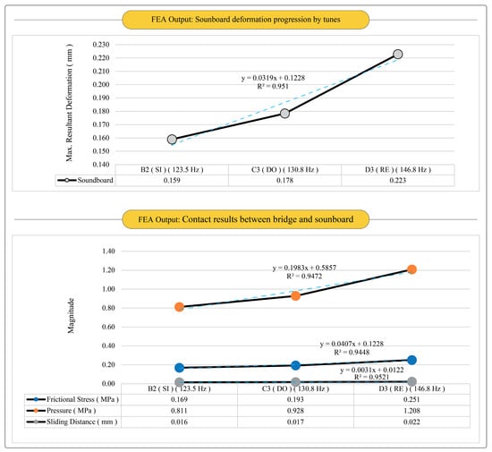 In string instruments, most especially, soundboard deformation under string tension affects the sound occurrence and quality. Structural deformation can disrupt the instrument’s inherent resonance and vibrational patterns and it can lead to unintended buzzing, rattling, or other undesirable noises when playing. This can occur when the strings come into contact with frets, bridges, or other parts of the instrument due to changes in the instrument’s geometry; however, specific to this study, it was interpreted that the deformation magnitudes on the soundboard did not negatively affect the sound quality and tune regulations, which was confirmed by frequency outputs and performer feedback. The contact results revealed the frictional stress (0.251 MPa at the D3 tune) and contact pressure (1.208 MPa at the D3 tune) between the bridge and soundboard and the outputs related to contact results were seen to increase from the B2 (Si) tune to the D3 (Re) tune. Lateral sliding (in the Z direction) of the bridge on the soundboard was also observed (0.022 mm at the D3 tune). It was interpreted that the contact results did not disturb the sound occurrence. Numerical data supported the graphical expressions of the simulation outputs, and soundboard deformation by settled tunes and contact results between the bridge and soundboard are given in Figure 6 and Figure 7, respectively.