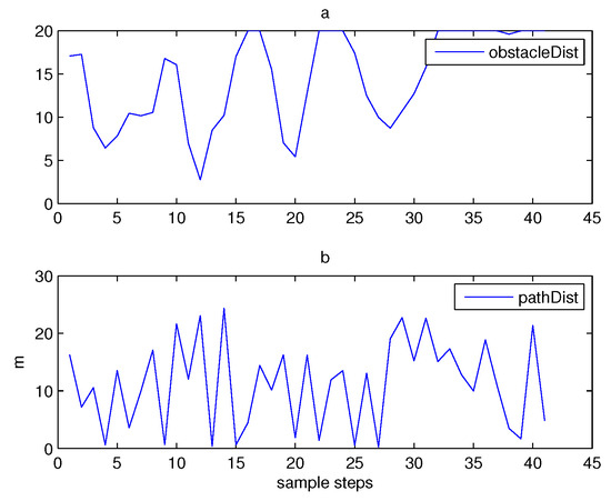 Considering the scenario in Figure 8, Figure 10a shows the relative distance between the robot and its closest at each sample-step. Since the robot’s maximum sensing range is 20 m, the relative distance is bounded above by 20 m. A collision occurs at the moment when the distance between the robot and any is shorter than 1 m. See that no collision happens during the robot maneuver. Recall that defines the point on the path , which is closest to the robot at sample-step k. Figure 10b indicates the relative distance between the robot and at each sample-step k. See that the robot keeps following the path .