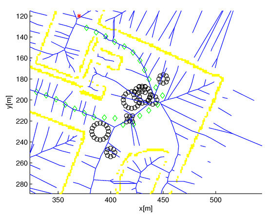 For instance, we depict a map which is composed of mapPoints. In Figure 3, mapPoints are plotted with yellow points. Blue curve segments in this figure indicate the trimmed Voronoi graph, which is obtained after removing vertices that are too close to mapPoints. Figure 4 is the enlarged figure of Figure 3. See that mapPoints are clustered around map boundaries. In simulations, we removed a Voronoi vertex, whose distance from a mapPoint is less than a certain distance, say (5 m in MATLAB simulations).