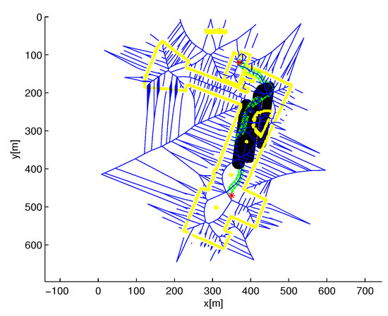 We next consider a case where each object has various shapes, other than a circle. Considering one MC simulation of floor (static objects), Figure 11 shows the robot’s location (green diamonds) at every seconds. The boundary of each object with arbitrary shapes is depicted with black colors. The robot plans the path from to the elevator location . Figure 12 is the enlarged figure of Figure 11. See that the robot’s path slightly deviates from Voronoi edges (blue line segments), in order to keep away from colliding with an object.