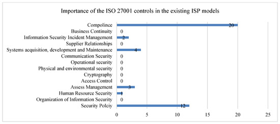 This review revealed the importance of the ISO 27001 controls in the existing ISP studies. Figure 3 illustrates the significance of each ISO 27001 control in the existing ISP models. Only the top three most significant controls were considered by most existing studies. It is possible to assume that Compliance, Security policy, and System acquisition controls have larger significance. On the other hand, several security controls were shown to be of no significance. For example, 19 models covered compliance control, 12 models covered security policy control, 4 models covered system acquisition control, 3 models covered assess management, 2 models covered information security incident management control, and 1 model covered human resource security control.