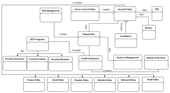 Therefore, three kinds of relationships were identified, namely Association, Specialisation, and Aggregation. The output of this step is the development of the information security policy metamodel (ISPM), as shown in Figure 4.