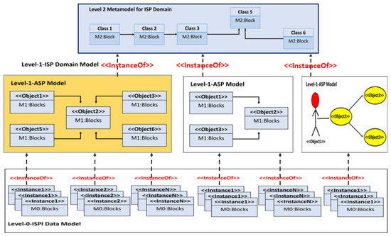 Therefore, this study developed a comprehensive metamodel called ISPM that is able to reconcile and recognise the diverse characteristics of the ISP field. The redundant security practices were combined in the developed ISPM. Figure 5 shows the three primary layers of the developed ISPM, which are utilised to control how the ISP field behaves. For instance, Level 2 of the developed ISPM is the abstract layer that unifies all the ISP field’s common security practices. The behaviour of the Level-1 objects is governed by Level 2. The primary ISP field model, Level 1, represents the key characteristics, functions, and connections of the ISP field model. Additionally, it controls how the Level-0 ISP user model behaviour should be. Level 0 represents the ISP’s actual data. As a result, the Level-2 metamodel will use modelling blocks to express the knowledge of the ISP field. The primary building components that are frequently reused are the modelling blocks [32]. In many instances of the ISP field, the metamodel blocks are a collection of properties and operations that are reused [33]. In this study, an ISP’s operations and properties are contained in a model block. Table 4 illustrates the availability of a model block at three levels of metamodel: Level 2-Metamodel, Level-1-ISP Field Model, and Level-0-ISP User Data Model. The M1-Block is used to represent an example of security practices in the M1-ISP Model, whereas the M0-Block is used to represent the data of the example of a common security practice in the M0-ISP User Data Model, and the M2-Block is used to represent a portion of the common security practices in the Level 2-Metamodel. As a result, the building blocks of the metamodel common security practices that were previously discussed are represented as the activities, tasks, responsibilities, processes, information, and plans of the ISP field. Each metamodel common security practice is therefore represented by a UML class as shown in Table 4. These are the following fields in each ISPM Class: