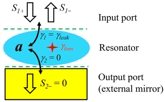 Schematic of a lossy one-port resonant system with an external mirror on the backside (that is, output port). a denotes the mode amplitude of the resonator. S1+, S1−, and S2− are the incident, reflected, and transmitted field amplitudes, respectively. γ1 (=γleak) and γ2 (=0) denote the mode leakage rate to the front side and back side of the resonator, respectively. γloss denotes the loss rate of the resonator. The green dashed lines are reference planes for the field amplitudes in the ports.
