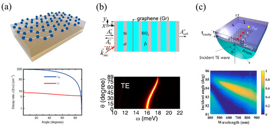 In 2017, Fan et al. [18] experimentally showed angle-selective giant light absorption by placing large-area unpatterned graphene on a structure consisting of a dielectric layer atop a gold mirror (Figure 2a). The doped graphene has metallic property due to hf < 2Ef. Such a simple structure supports a resonance mode with light trapped in the dielectric layer owing to the reflections at its top and bottom surfaces. The loss rate is insensitive to incident angle, whereas the leakage rate reaches zero at 90 degrees. Thus, the critical coupling condition can be always satisfied by adjusting the incident angle, even though the critical angle is a considerably high value. In ref. [19], the proposed structure can lead to perfect THz absorption because of strong light localization in the defect layer of the heterostructure using two Si/SiO2 DBR (Figure 2b). When the incident angle increases, the resonant peak shifts toward higher frequencies due to the correlation between the resonance frequency and the incident angle. In 2016, Zhao et al. [20] proposed a multi-layer photonic configuration, which consists of an ultrathin metal film coated on a DBR and a graphene sheet in a silica spacer. The monolayer graphene exhibits an impressive absolute absorption of light, which can reach up to 80% (34.8-fold enhancement compared to the intrinsic value of 2.3%), due to the strong field confinement of Tamm plasmon in the silica spacer. The Tamm plasmon originates from the appropriate combination of a metal film (not a dielectric graphene) and a DBR. Changing the incident angle is a straightforward method to efficiently adjust the operating wavelength of graphene absorption. In detail, the absorption peak wavelength experiences a blueshift as the incident angle increases.