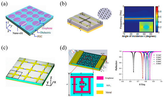 In the mid-IR to THz regime (strictly, hf < 2Ef), due to the metallic property of doped graphene, tunable graphene plasmons can be utilized by periodically patterning graphene itself. In 2012, Abajo et al. [21] reported that 100% light absorption can take place in the graphene disk arrays supported on a dielectric-coated gold surface, provided that the critical coupling condition is satisfied by properly choosing the dielectric coating layer thickness. Liu et al. [22] incorporated an air nano-slit into a similar structure, positioned at a specific displacement distance from its center, as illustrated in Figure 3a. The air nano-slit can not only exhibit an efficient asymmetrical characteristic for the graphene disk but also proposes a viable approach for realizing a high-Q resonant spectrum. Also, there have been many reports based on different metamaterials, such as graphene ribbon arrays [34,35], square metal patches [36], cross-shaped resonators [36,37], and split-ring resonators [36,38], as shown in Figure 3b–d. Most importantly, plasmon resonances in patterned graphene also exhibit good absorption stability over a wide-angle range [34,35], as shown in Figure 3b, similarly to plasmon resonance in noble metals [31].