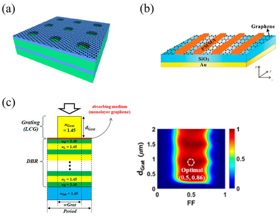 GPAs using unpatterned graphene and periodically patterned dielectric structures. (a) Schematics of a GPAs based on photonic crystal slab backed by DBR [24]. (b) Schematics of a GPAs based on PMMA grating on top of back gold mirror [29]. (c) Left: schematic of a GPA based on low-contrast grating (LCG) and DBR. Right: absorption map as a function of FF and dGrat at λ = 1550 nm [33]. Reproduced with permission from [24,29,33], © 2023 American Chemical Society; © 2023 WILEY-VCH; © 2023 Springer Nature.