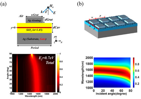 For certain graphene-based optoelectronic devices, achieving broadband graphene absorption with incident angle independence is highly desirable. In particular, GPAs designed by coupling the graphene with metal nanocavity can effectively provide angle-insensitive absorption due to the magnetic dipole resonance based on plasmon in metals [23,31]. In 2015, Kim et al. [23] proposed an electrically tunable absorber based on epsilon-near-zero (ENZ) effect of graphene embedded in a nanocavity, which is composed of metal grating and metal reflector (Figure 5a). When hf is close to 2Ef, graphene can be an ENZ material with vanishingly small permittivity [23,79] at certain wavelengths under the proper contributions of interband and intraband transitions. Due to the strong surface-normal electric field confined in ENZ graphene, greatly enhanced absorption is achieved. Moreover, owing to the ENZ effect and the magnetic dipole resonance, it has a unique feature of incident angle insensitiveness. In 2018, Qin et al. [31] also demonstrated the GPA based on a deep subwavelength 2D square plate, where graphene has a dielectric property because undoped graphene is applied (Figure 5b). Similarly to the structure described in ref. [23], the electric field is mostly concentrated around the bottom corners of the silver plates, and the magnetic field is highly confined in the dielectric layer between the silver plates and silver reflection mirror. The direction of the magnetic field of the TM incident wave remains unchanged with varying incident angles, which can effectively drive a current loop circulating the cavity, and thus, the angle dependence of its resonant wavelength is significantly weak. Compared to GPAs using the patterned dielectric structures of Figure 4, a wider absorption bandwidth is obtained at the cost of high ohmic loss in noble metals.