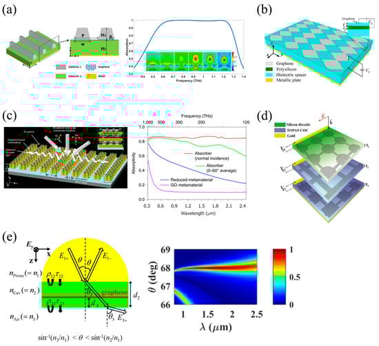 Thirdly, the prism-coupling absorber scheme can be also utilized for ultra-broadband absorption. Kim et al. [44] proposed GPAs of ultra-wide bandwidths based on prism coupling with wavelength-insensitive phase matching, which consists of three dielectric layers (prism–cavity–air) with monolayer graphene embedded in the cavity layer (Figure 6e). Due to inherent material dispersion of the dielectric layers in near-IR regime, with the proper choice of the incidence angle and the cavity thickness, the proposed perfect absorbers can satisfy the phase matching condition over a wide wavelength range, inducing enormous enhancement of the absorption bandwidth. According to theoretical investigation, 99% absorption bandwidth of ~300 nm with perfect absorption at λ = 1.51 μm can be achieved, which is ~7 times wider than the conceptual design based on the non-dispersive materials.