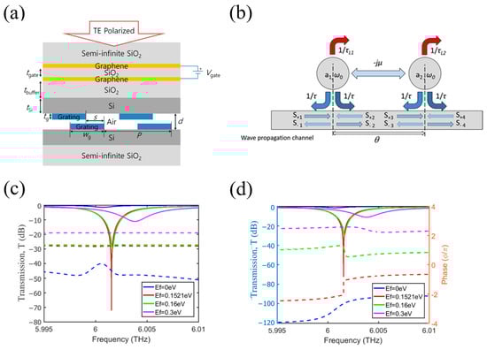Most of the THz PAs that have been proposed thus far are of the reflection type. As a result, the relevant modulators are also of the reflection type, meaning that only the reflected wave can be modulated. In 2019, Kim et al. [88] proposed a GPA scheme employing an all-pass filter such that it functions as a highly efficient transmissive modulator in the THz range (Figure 8). All-pass filter generates a very rapid change from 0 to 360 degree in the vicinity of the resonance while maintaining a unity transmission efficiency, and in general, it is necessary to use at least two resonances (or resonators) [89,90,91,92]. In ref. [88], the proposed absorber is composed of two coupled grating resonators with mirror inversion-symmetry as a pure all-pass filter, and the graphene layers are added to introduce loss (Figure 8a). They also theoretically analyzed the proposed scheme using the temporal coupled mode theory. The two resonators are coupled both indirectly, through the propagation channel with a phase retardation of θ, and directly, through evanescent coupling with a coupling coefficient of μ (Figure 8b). The perfect absorption is obtained when θ = π/2, μ = 2/τ, and τL1 = τL2 = τ/2, which is completely different from degenerate critical coupling condition [80] because the suggested absorber scheme considers the coupling of two identical resonators. At the optimal structure, a considerably high modulation depth (~70 dB) is achieved via graphene chemical potential variation of ~0.15 eV because the proposed transmissive modulator scheme is based on the low transmission state of the near perfect absorption (~99.8%) (Figure 8c,d). In ref. [45], there is another type of PA scheme with a similar inversion symmetry, in which a two-resonance, four-port model is required. Two opposite-direction propagation modes with nonzero in-plane momentum were considered. However, the design and fabrication of the structure will be rather complicated because the scheme works only for an oblique incident angle.