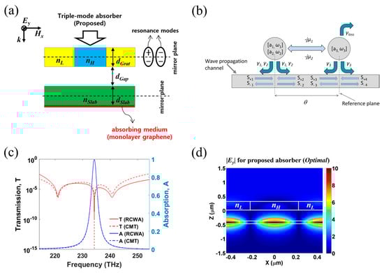 As aforementioned, the mirror-less GPA is extremely desirable for circumventing numerous limitations associated with the use of the external mirror such as DBR or metal reflector. As an alternative, one-port mimicking absorber scheme is conceptually to mimic a single-mode/mirror system by introducing the internal (or virtual) mirror in a two-port system, and thus the relevant absorption efficiency can be approximately described as Equation (1). In 2017, Kim et al. [46] proposed a novel device structure for the perfect absorption of single-sided illumination, which consists of a high-contrast grating (HCG) with a broadband reflection spectrum, a slab separated by a gap region, and monolayer graphene placed just below the slab (Figure 9). In the CMT analysis, the authors treated the HCG as a lossless resonator with two nondegenerate resonance modes with high leakage rates γ1 and γ2 and resonance frequencies ω1 and ω2, respectively, while the slab with a graphene layer is treated as a lossy single-mode resonator with a low leakage rate γ3, a loss rate γloss, and a resonance frequency ω3 (Figure 9b). The proposed scheme can be dubbed triple-mode absorber’. The perfect absorption is obtained through proper direct and indirect coupling between the HCG and slab, by which the HCG (as a 100% internal mirror) and slab (as a single-mode resonator) act as single-mode/mirror system, that is, one-port mimicking. Regardless of the existence of graphene layer, transmission becomes zero. The proposed absorber provides excellent tolerance to structural parameters and graphene quality due to the strong field enhancement in the slab region (Figure 9d). Also, absorption spectrum tuning over a wider wavelength range of ~300 nm is possible, keeping significantly high maximum absorption (>95%). These results mean that the proposed scheme significantly relieve the complexity of absorber design compared to the degenerate critical coupling absorber (or dual-mode absorber) [80] because the frequency degeneracy condition is no longer required.
