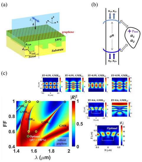 Recently, Kim et al. [47] proposed one-port mimicking scheme in an asymmetric single resonator supporting two degenerate resonant modes (Figure 10). Although the two coupled resonator-based PA scheme mimicking the one-port system has many advantages [46], in general, a single resonator-based structure is preferred in terms of fabrication simplicity if no specific structural symmetry is required [47,48,49]. In the designed GPA with undoped monolayer graphene placed on a slab–waveguide grating (SWG), only one of the guided-mode resonance modes (GMR21) is responsible for absorption, while the other (GMR13) plays as an internal 100% mirror in conjunction with the Fabry–Perot-like background scattering. The operation concept was confirmed through CMT analysis (Figure 10b). Almost perfect absorption (A > 99.95%) was achieved at the resonant wavelength of the high-Q GMR21 mode. Unlike the degenerate critical coupling absorber [80], the proposed SWG structure is vertically asymmetric, and thus, two degenerate resonant modes (that is, GMR13 and GMR21) are indirectly (not directly) coupled due to partial reflection in the internal wave propagation channel (Figure 10c). The designed device also showed enhanced fabrication error tolerance, which was approximately an order of magnitude larger compared to the scheme based on degenerate critical coupling [80]. Since the proposed GPA structure does not require any structural symmetry, its design is straightforward, and its fabrication will be easier.