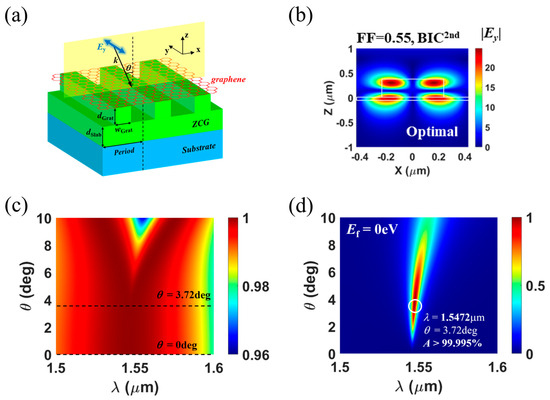 In the GPA design, the critical coupling condition is a common and essential requirement. Mostly, the leakage rate of any resonant mode can hardly be adjusted after device fabrication because it is determined by structural parameters. On the other hand, due to the difficulty of the precise control of the quality of synthesized graphene and unwanted doping in graphene transferred to the substrate, the loss rate of graphene is rather unpredictable, so that the perfect absorption is quite difficult to achieve in practice. To solve this problem, in 2021, Kim et al. [49] proposed the GPA with a loss-adaptive Q-factor control function enabled by quasi-BIC, in which its leakage rate is adapted to the loss rate by a proper choice of the incident angle (Figure 11). The proposed absorber consisting of monolayer graphene placed on an SWG that supports both quasi-BIC and GMR. Similarly to the one-port mimicking scheme in asymmetric resonators of [47,48], the quasi-BIC (in detail, BIC2nd) is responsible for absorption, while the GMR (in detail, GMR1st) works as an internal mirror. Another outstanding feature of the proposed PA is remarkably uncomplicated manufacturing process since absorbing medium (including graphene) is placed on the ridge side of the SWG. Moreover, the proposed device scheme can have an arbitrarily small leakage rate via adaptive control of the incident angle, and thus, it can be used to implement a PA for any kind of ultrathin absorbing media.