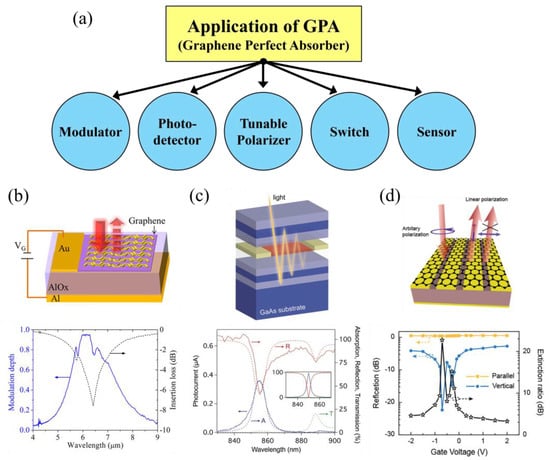 Until now, practical applications of GPAs have yet to reach a state of maturity. In this section, we briefly introduce a few optoelectronic applications of GPA structures using external mirrors. Figure 12a indicates the schematic depiction of the possible applications, such as high-efficiency modulators [14,15,36,93,94,95], photodetectors [12,13,16], tunable polarizers [96,97,98], switches [99,100,101,102,103], and sensors [104,105,106].