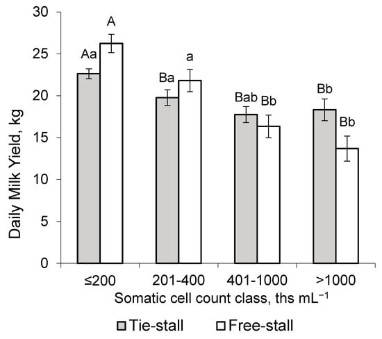 The effect of the housing system × somatic cell count (SCC) interaction on daily milk yield (means ± SEM): A, B (p ≤ 0.01); a, b (p ≤ 0.05).