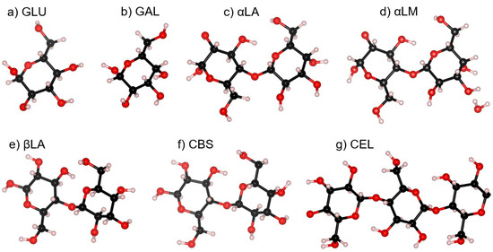 The chemical structures of the studied saccharides (the abbreviations used to denote the compounds are explained in the Section 2.1 Sample). Black, red, and white spheres represent, respectively, carbon, oxygen, and hydrogen atoms.