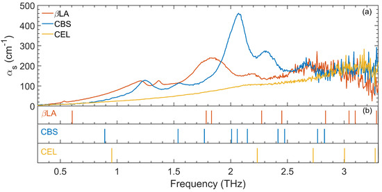 The THz spectra of LA, CBS, and CEL are shown in Figure 2a. Across all spectra, a general trend emerges: the absorption coefficient rises with frequency, transitioning from levels below 10 cm at 0.3 THz to approximately 200 cm at 3 THz. The increasing background intensity as a function of frequency is a common trend for organic molecular crystals, and it is due to the increasing vibrational density of states (VDOS) of the amorphous phase in the compounds [7,30]. Superimposed on this trend, several peaks due to the crystalline phases can be observed, whose frequency and intensity strongly depend on each compound (Table 2).