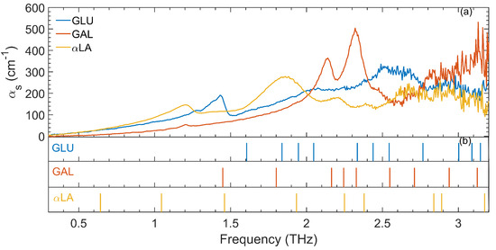 (a) THz absorption coefficient of GLU, GAL, and LA. All the spectra show absorption peaks superimposed to a background intensity increasing as a function of frequency. (b) Simulated low-frequency THz vibrational modes (color vertical lines).