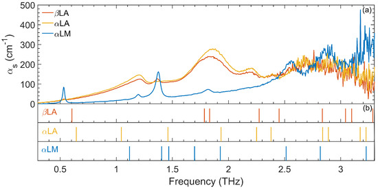 The THz absorption spectra of LA, LA, and LM are shown in Figure 4a. Furthermore, for these spectra, as a function of frequency, an increasing background intensity due to the amorphous phase in the compounds is observed [7,30]. Superimposed on this trend, several peaks due to the crystalline phases can be observed whose frequency and intensity depend on each compound (Table 2). The experimental absorption spectra of the two anhydrous isomeric forms of lactose, LA and LA, are qualitatively and quantitatively very similar, showing five peaks of similar intensity in the range 0.3–2.9 THz centered at 1.20, 1.83, 2.21, 2.39, and at approximately 2.68 THz for LA, and at 1.19, 1.86, 2.20, 2.39, and at approximately 2.68 THz for LA (Table 2). Moreover, LA shows two low-intensity peaks at 0.53 and 1.37 THz.