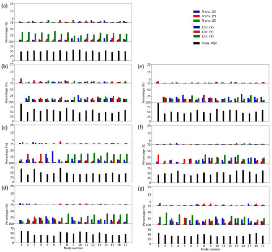 Here, signifies the atomic displacement vectors of an irreducible molecule in the nth normal mode, with V representing X, Y, or Z and l pertaining to the three translations and three principal librations. N denotes the number of atoms in the molecule. The percentage contribution of each component within the nth mode is computed as follows:
