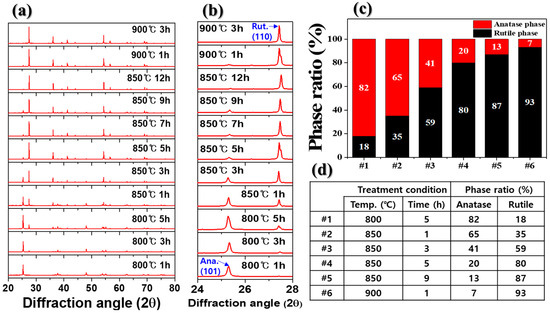 For the preparation of composite TiO2, 80 nm anatase TiO2 (purity > 99.8%, Ditto Technology Co., Ltd., Gunpo, Republic of Korea) was used as the starting material. To control the anatase–rutile phase ratio, heat treatment was performed at a temperature range of 800 to 900 °C for 1 to 9 h. In addition, anatase TiO2 and 60 nm rutile TiO2 (purity > 99.8%, Armstec Ind. Co., Ltd., Hwaseong, Republic of Korea) were weighed and mixed such that the anatase–rutile phase ratio matched with that of the heated composite TiO2.