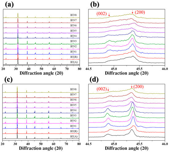 The BaCO3–TiO2 powders, mixed as described above, were calcined at 1000 and 1100 °C for 2 h. XRD analysis of the powders obtained via solid-state synthesis at 1000 °C under respective mixing conditions revealed the presence of typical BaTiO3 crystal structures. By analyzing the diffractions from the (002) and (200) planes of the synthesized BaTiO3 powders, a structure closely resembling a cubic structure, without distinct peak splitting of the (002) and (200) planes, was confirmed for the BaTiO3 powder obtained via solid-state synthesis using 100% anatase TiO2 and 100% rutile TiO2, respectively (Figure 3a,b). In addition, observing clear 002/200 peak splitting was difficult in the case of the BaTiO3 powder synthesized using a simple mixture of anatase and rutile TiO2 powders. However, in the XRD patterns of the BT#1 to BT#4 powders synthesized using the composite TiO2 powder prepared under the annealing conditions of #1 to #4, apparent 002/200 peak splitting appeared. In the case of BaTiO3 powders BT#1 to BT#4 synthesized at a temperature of 1100 °C, apparent peak splitting was observed on the 002/200 planes. However, 002/200 peak splitting was not apparent in the case of the BT#5 to BT#8 powders, which used the simply mixed TiO2 powder.