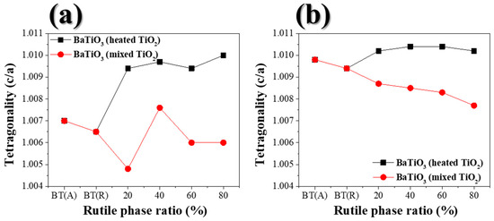 Tetragonality of BaTiO3 prepared using different TiO2 samples through solid-state synthesis via Rietveld analysis: (a) 1000 °C × 2 h and (b) 1100 °C × 2 h.