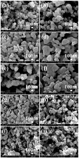 Microstructure of BaTiO3 powders synthesized at 1000 °C under different TiO2 conditions: (a) BT(A), (b) BT(R), (c) BT#1, (d) BT#2, (e) BT#3, (f) BT#4, (g) BT#5, (h) BT#6, (i) BT#7, and (j) BT#8.