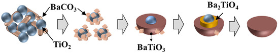 At the initial stage of the reaction, BaCO3 contacts the surface of TiO2, and BaTiO3 is formed via diffusion and an interface reaction (Equation (1)). The continuous adsorption of BaCO3 and diffusion of ions result in the development of an intermediate-phase Ba2TiO4 (Equation (2)). Finally, Ba2+ ions diffuse to the inside of TiO2, forming BaTiO3 (Equation (3)). In particular, the solid-state synthesis reaction using two materials, BaCO3 and TiO2, involves the synthesis of BaTiO3 through the unilateral diffusion of Ba2+ ions into TiO2 [32].