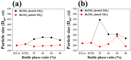 Comparative analysis of the mean particle size of BaTiO3 powders obtained via solid-state synthesis at 1000 and 1100 °C using composite TiO2 and mixed TiO2. Solid-state synthesis conditions: (a) 1000 °C × 2 h and (b) 1100 °C × 2 h.
