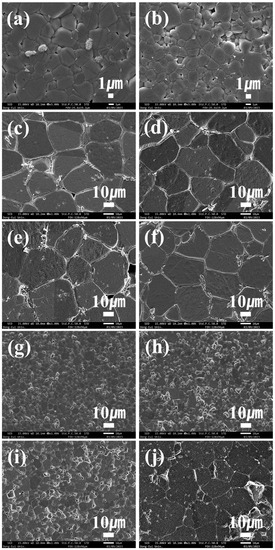 Fractured surface analysis of sintered specimens of BaTiO3 powders obtained via solid-state synthesis under the conditions of 1000 °C × 2 h. Sintering conditions: 1300 °C × 2 h. (a) BT(A), (b) BT(R), (c) BT#1, (d) BT#2, (e) BT#3, (f) BT#4, (g) BT#5, (h) BT#6, (i) BT#7, and (j) BT#8.