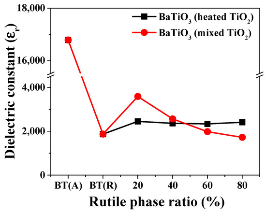 For powders synthesized via solid-state synthesis using composite TiO2 under BT#1 to BT#4 conditions, a stable dielectric constant value of approximately 2400 was observed (Table 2). Moreover, when mixed TiO2 was used for solid-state synthesis, the dielectric constant of the synthesized BaTiO3 gradually decreased with an increasing rutile phase ratio (Figure 11). The dielectric constant is an essential piece of information when designing capacitors and in other circumstances where a material might be expected to introduce capacitance into a circuit. The dielectric constant is the ratio of the capacitance of the capacitor with test material as the dielectric to the capacitance of a capacitor with vacuum (or air) as the dielectric [45].
