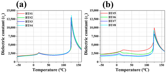 The changes in the dielectric constant were analyzed according to the temperature changes for the specimens sintered at 1300 °C with powders synthesized under the BT#1–BT#8 conditions, as shown in Figure 12. In the case of powders synthesized under the BT#1 to BT#4 conditions that used TiO2 with a controlled anatase–rutile phase ratio through annealing, considerably high dielectric constant values were achieved near the Curie temperature (Tc). However, for the powders prepared using simply mixed TiO2, relatively low dielectric constant values were confirmed at Tc. BaTiO3 exhibits a tetragonal crystal structure in the temperature range of ambient temperature–Tc, and when the temperature increases above Tc, the BaTiO3 crystal structure changes to a cubic phase. Therefore, BaTiO3 prepared using composite TiO2 requires high activation energy for transformation from a tetragonal structure to a cubic structure, whereas in the case of BaTiO3 formed using mixed TiO2, the crystal structure can be changed with relatively low activation energy.