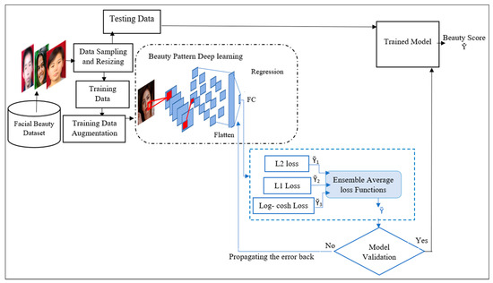 The beauty-related industries have witnessed significant expansion globally, owing to their multifarious beneficial applications in the entertainment, digital media, plastic surgery, and cosmetic sectors. To this end, various studies have been conducted by researchers, medical practitioners, and artists to investigate and measure facial beauty [1,2,3]. The task of predicting facial attractiveness is a complex and important undertaking in the field of computer vision and machine learning. Building robust and effective FBP models is challenging due to the variability of facial appearance and the complexity of human perception. Conventional methods for predicting face beauty were based on hand-crafted features; these features are manually extracted and then fed to a classifier or a regressor [4]. Facial geometry, color, texture, and other local characteristics are some examples of feature-based representation. Nonetheless, the effectiveness of statistical and traditional machine-learning techniques for extracting and predicting beauty features diminishes with the emergence of sophisticated deep neural networks [5]. The remarkable capability of CNNs to learn discriminative features has led to significant advancements in computer vision. In addition, both deep and machine learning are characterized by applying statistical methods to allow computers to learn from the data supplied.
