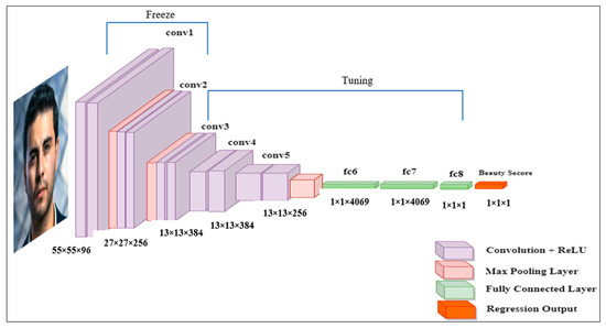 The AlexNet [43] is an eight-layer CNN comprising five convolutional layers and three fully connected layers. Figure 2 and Table 3 show the layer configurations of the proposed AlexNet-regression-based for FBP. The ReLU activation function is employed in all layers except for the output layer that uses the Softmax activation function. To accurately estimate the facial attractiveness score, the knowledge of AlexNet was transferred, and its architecture was modified. This involved substituting the regression-loss function for Softmax, which transformed the classification process into a regression task. Moreover, this was due to the fact that the lower layers of a CNN can learn general low-level features, while higher layers capture task-specific features. We proposed reusing the pretrained weights of lower layers and tuning higher ones. This approach saves time, lets the network adapt efficiently, prevents overfitting, and preserves generalization ability; it was applied to freeze the first two convolutional layers and tune the rest of the layers to be adapted for facial aesthetic assessment.