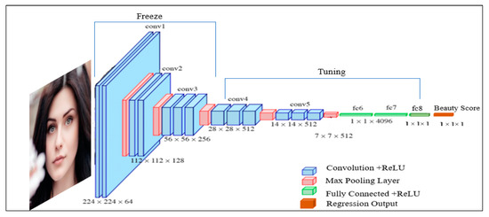 The VGG16 network [44] is structured with 3 × 3 convolution layers that extract features, five 2 × 2 max-pooling layers, and three dense layers, as shown in Figure 3 and Table 4. To utilize the VGG16 network in FBP, we fine-tuned it and replaced the final dense layer comprising a large number of neurons with a single neuron to investigate the training of the VGG16 network on each of the three loss functions individually and proposed their combination for the FBP. By incorporating the proposed ensemble loss function into the output layer instead of the Softmax function and freezing the initial three layers, the accuracy and robustness of the fine-tuned model in estimating the facial attractiveness score were enhanced. The alteration of the VGG16 architecture to include the ensemble loss function led to a more efficient performance in the regression task of FBP.