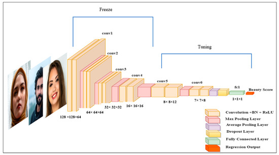 FIAC-Net is a lightweight CNN that we developed in [41]. It stands for Facial Image Attractiveness Classification Network. It is constructed with six convolutional layers of varying kernel sizes, accompanied by five layers of 2 × 2 Max pooling. An average-pooling layer precedes the final layer, which is one fully connected layer. The ReLU activation function is uniformly utilized across all layers, with the exception of the output layer that employs the Softmax activation function. FIAC-Net was pretrained to classify the attractiveness level in a facial image by utilizing different FBP benchmarks, including the CelebA dataset. The CelebA dataset [42] contains over 200K facial images of celebrities that represent a diverse range of facial characteristics, poses, and expressions. This variability presents significant challenges for facial-attractiveness classification. This variability allows the deep-learning model to learn and capture informative and robust features related to facial attractiveness. Pretraining on the CelebA dataset can provide a rich source of facial-image data that can aid in learning patterns of facial attractiveness. The FIAC-Net is fine-tuned through the substitution of Softmax with the regression layer that results in the alteration of the classification process into a regression task. Furthermore, the freezing of the initial four convolutional layers is executed, succeeded by the calibration and tuning of the subsequent layers to conform with the prerequisites of FBP adaptation. Figure 4 and Table 5 illustrate the structure of the proposed FBP based on the FIAC-Net model.