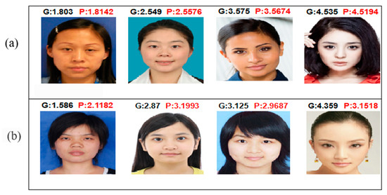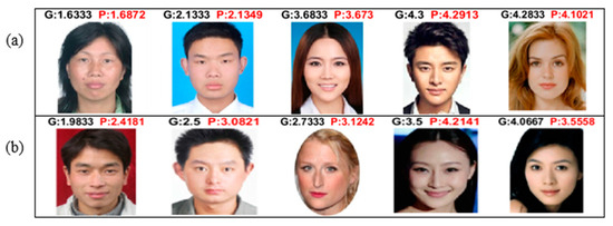 Samples of tested SCUT-FBP data on the fine-tuned FIAC-Net. G, ground truth; P, model-predicted score. (a) Accurately predicted instances and (b) inaccurately predicted instances.