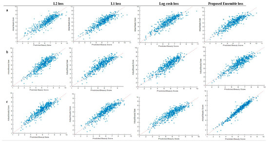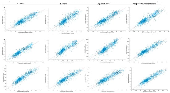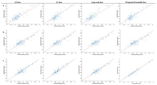 Furthermore, the proposed ensemble average model, which combined the different loss functions, achieved an average PC of 0.9305098, an MAE of 0.2028174, and an RMSE of 0.2614154. These results indicate that the ensemble model slightly outperformed the L2 loss function in terms of PC, MAE, and RMSE. Consequently, this suggests that the proposed approach can potentially enhance the performance of FBP. Figure 7 illustrates the model predictions obtained by applying the fine-tuned FIAC-Net with the validation fold on the SCUT-FBP5500 dataset. Meanwhile, Figure 8 displays a visual representation of the utilized loss functions incorporated with the fine-tuned CNNs. The results indicate that the proposed ensemble loss function with the fine-tuned FIAC-Net achieves a competitive performance in predicting beauty scores, thus highlighting its efficiency.