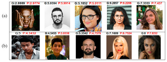 MEBeauty samples tested on the FIAC-Net. G, ground truth; P, model-predicted score. (a) Accurately predicted instance and (b) inaccurately predicted instances.