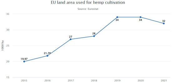 Hemp has been known for many years and cultivated mainly for the textile industry []. According to the European Commission data, in recent years the area of hemp cultivation within the European Union has increased by 75%, from 19,970 hectares in 2015 to 34,960 ha in 2019. In the same years, the production of hemp increased by 62.4%, from 94,120 to 152,820 tons. The largest hemp producer in Europe is France, accounting for more than 70% of EU production. The next two countries are the Netherlands and Austria, with production of 10% and 4%, respectively. Hemp cultivation in the EU has dropped minimally to approx. 32,000 ha in 2021 [] (Figure 1).
