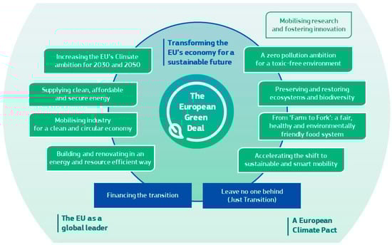 The main goal of the European Green Deal (EGD) is to make Europe the first climate-neutral continent. This task is to be achieved by taking the following actions: transitioning the economy and societies, making transport sustainable for all, supporting clean technologies and products, cleaning energy systems, renovating buildings for more ecological lifestyles, coworking with nature and the environment for health and planet protection, and boosting actions for global climate [] (Figure 2).