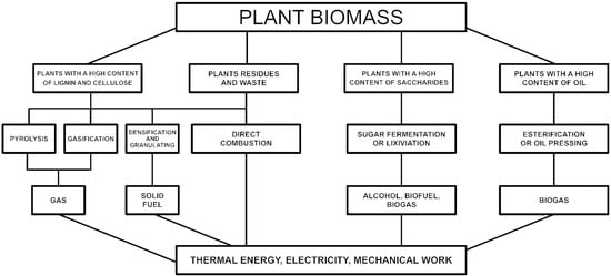 Biomass, both plant and animal, is regarded as an alternative energy source to fossil fuels. Even though significant amounts of energy are needed for their production and processing, their energy management is less inconvenient for the environment than the use of petroleum, lignite, or hard coal [,,]. This is due to its absorption of CO2 during plant growth, which significantly reduces the overall balance of the impact of biomass production on the ecosystem [,]. Plant biomass can be used to produce solid, liquid, and gaseous biofuels (Figure 6).