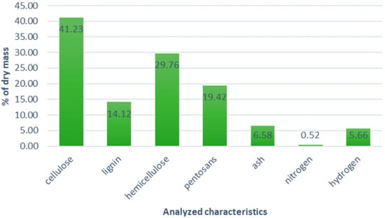 The hemp biomass at 8.5% humidity has a high content of cellulose—more than 40%—and hemicellulose—almost 30% (Figure 9), which makes it a valuable material for solid biofuel production, such as pellets or briquettes. In addition, hemp biomass heat of combustion is 18,300 kJ·kg−1, and the calorific value is 17,100 kJ·kg−1 []. The heat of combustion of hemp biomass is higher than the heat of combustion of other popular energy crops such as Hibiscus cannabinus (15,800 kJ·kg−1), Ripariosida hermaphrodita (17,200 kJ·kg−1), and Brassica napus var. napus (17,600 kJ·kg−1). Nevertheless, the calorific value is slightly lower than the calorific value of Triticum straw (18,700 kJ·kg−1) []. Solid biofuels from hemp biomass have a higher energy yield compared to other hemp biofuels such as biogas and liquid biofuels []. They can also be produced and used locally, even on individual farms or by small groups of farmers in the vicinity of hemp plantations.